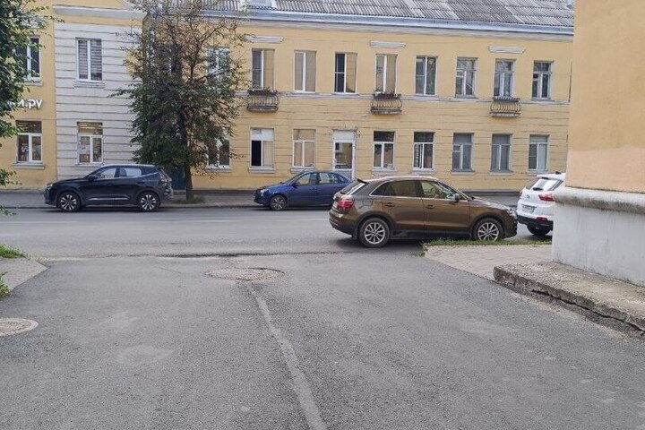 Пскович опубликовал фото, сделанное в центре Пскова, на котором видно, что пскович припарковал машину таким образом, что выезжая из-за нее многие рискуют получить удар в бок.