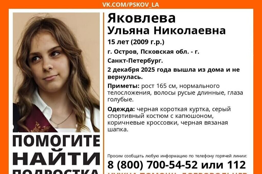В Острове ищут пропавшую 15-летнюю Ульяну Яковлеву. Она ушла из дома вчера,2 декабря, и ло настоящего времни не вернулась. Ориентировка на поиск девушки размещена в группе регионального отделения поискового отряда «ЛизаАлерт».