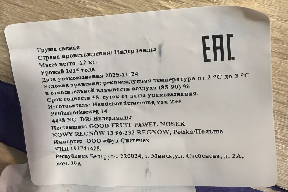 При досмотре грузового отсека машины инспекторы Россельхознадзора обнаружили партию свежих груш весом 20,2 тонны. Приклеенная этикетка содержала информацию о стране происхождения – Нидерланды.