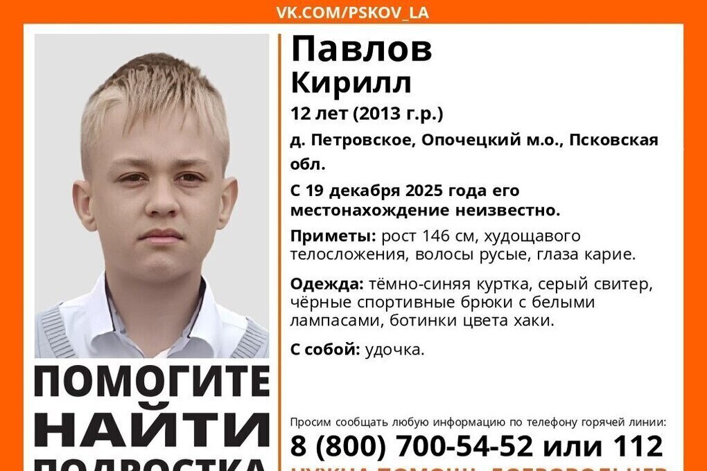 Тревожные вести приходят из Опочецкого района: 12-летний Кирилл Павлов не выходит на связь с 19 декабря. Региональный поисковый отряд «ЛизаАлерт» подтвердил информацию о пропаже подростка и активно ведет поиски.
