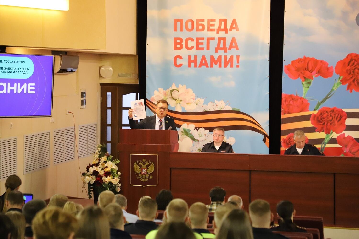 Сегодня в областном Управлении МВД России по Псковской области в рамках государственно-правового информирования к сотрудникам полиции пришли председатель Избирательной комиссии Псковской области Игорь Сопов и методист центра гражданского образования и культурологии Антон Петров.