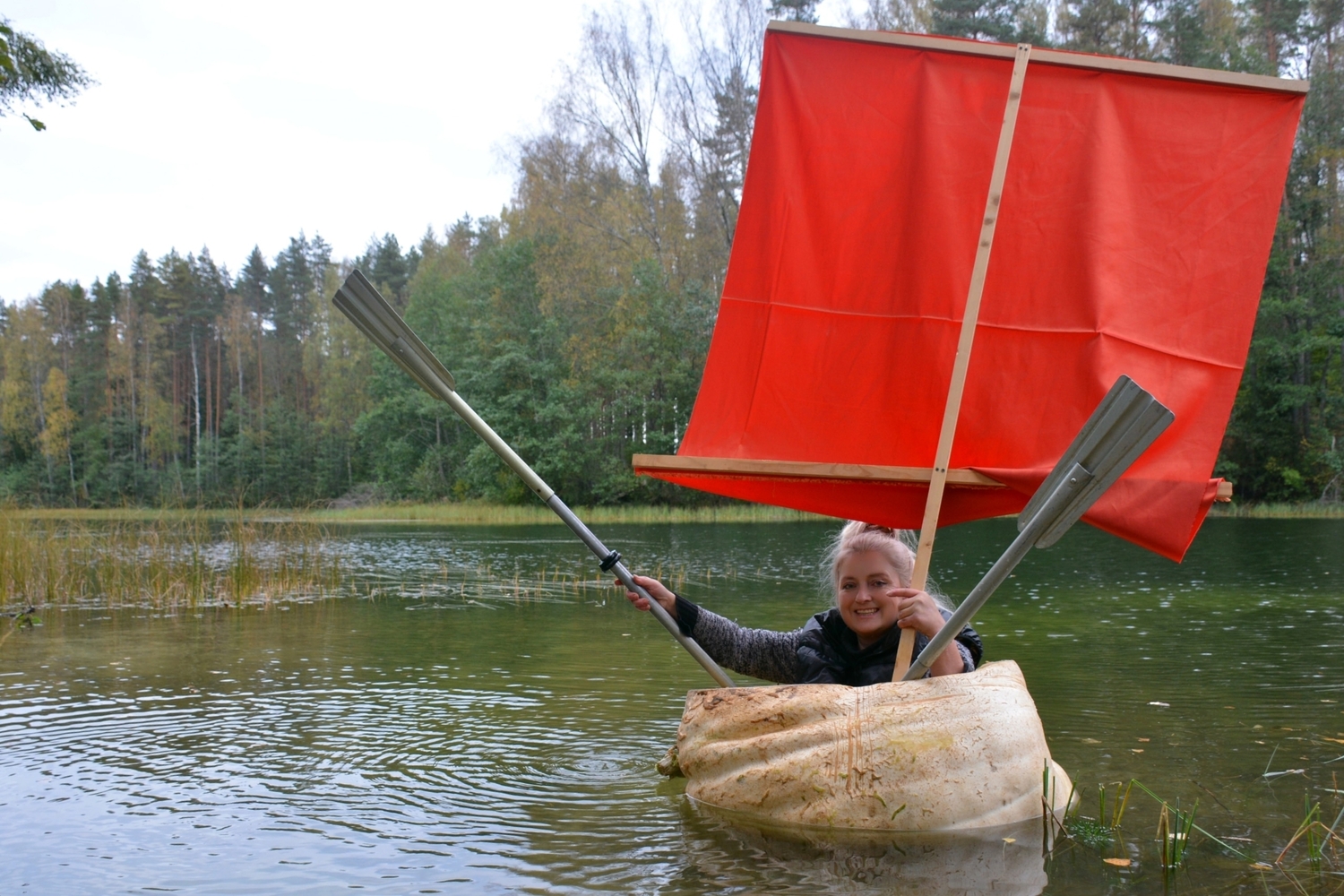Хорошо плывёт: петербурженка совершила заплыв на тыкве-корабле в Псковской области