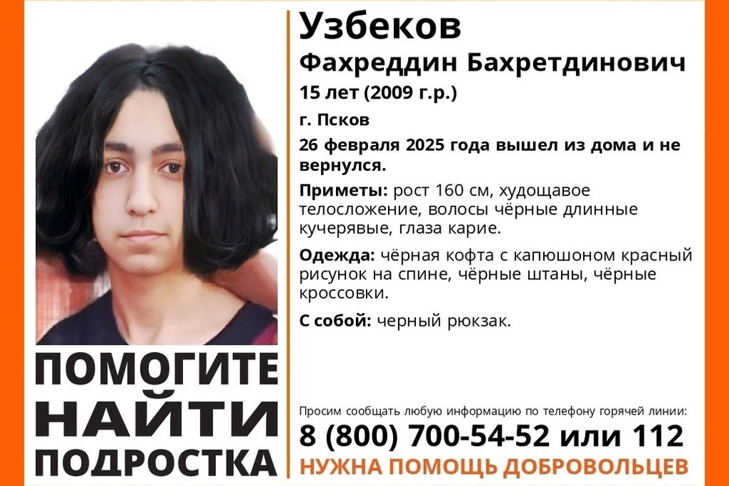 26 февраля Фахреддин Узбеков вышел из дома и не вернулся. Ростом он примерно 160 сантиметров, худощавого телосложения, с кучерявыми длинными черными волосами и карими глазами. В день исчезновения был одет в черную кофту с капюшоном и красным рисунком на спине, черные штаны, черные кроссовки. С собой был черный рюкзак.
