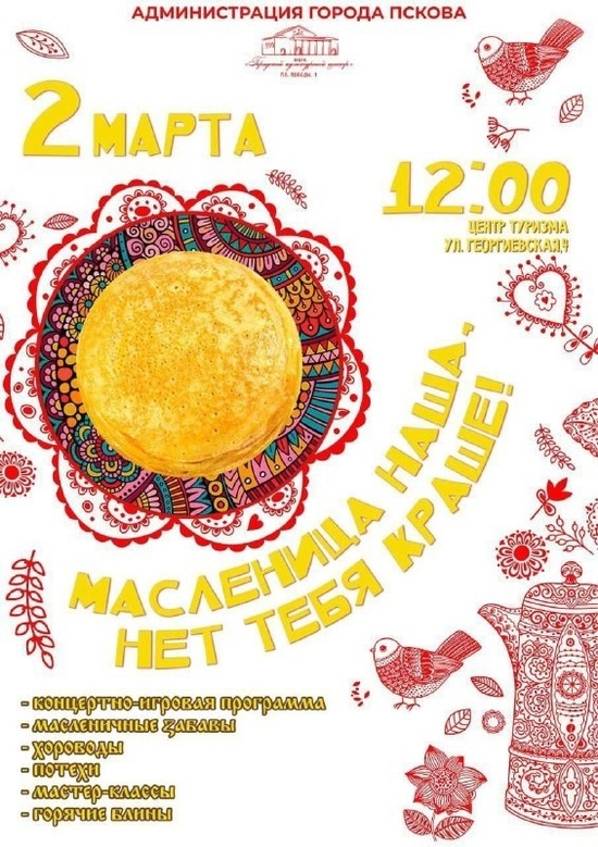 2 марта в 12:00 в усадьбе Беклешова пройдёт праздник Масленицы. Гостей ждут народные забавы, выступления артистов, мастер-классы от ремесленников и традиционные хороводы. Об этом "МК в Пскове" сообщили в администрации Пскова.