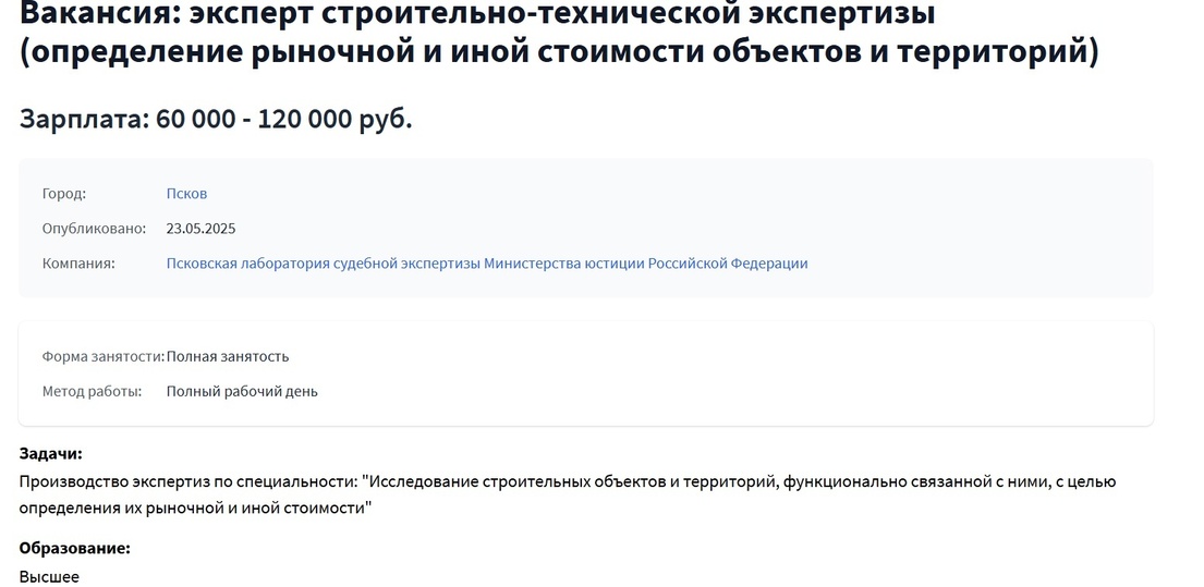 Так, в мае Псковская лаборатория судебной экспертизы Минюста РФ искала экспертов по оценке недвижимости, бизнеса и строительно-технической экспертизе с предложением оплаты до 120 тысяч рублей в месяц.