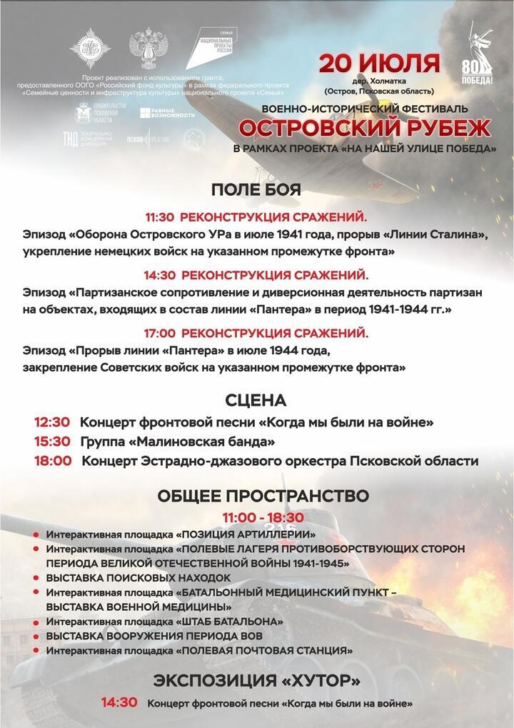 20 июля в деревне Холматка Островского района пройдет военно-исторический фестиваль «Островский рубеж», организованный в рамках проекта «На нашей улице Победа». Про программу фестиваля "МК в Пскове" рассказали организаторы мероприятия.