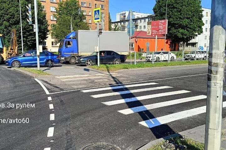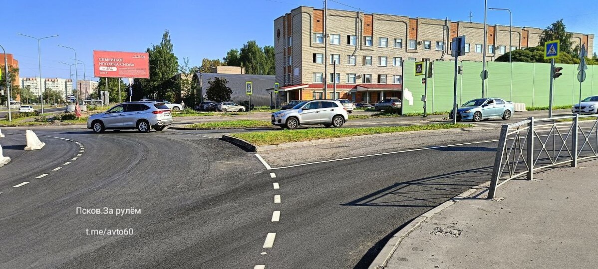 Как отмечает автор фото в телеграм-канале "Псков за рулем", нанесенный таким образом тип разметки позволяет исключить съезд из внутренней полосы.
