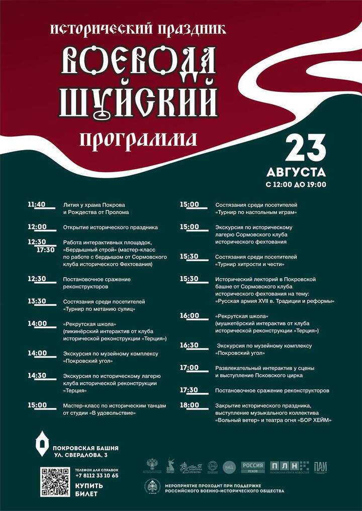 Праздник «Воевода Шуйский» пройдет при поддержке Псковского регионального отделения Российского военно-исторического общества. Организаторами выступают Псковский музей-заповедник, Псковский городской молодежный центр.