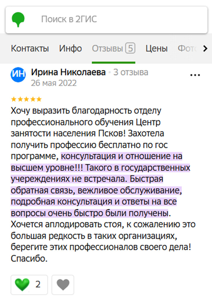 Ирина Николаева в отзыве на 2ГИС пишет: «Консультация и отношение - на высшем уровне. Быстрая обратная связь, вежливое обслуживание». Она также упоминает, что прошла бесплатное обучение по госпрограмме и смогла найти подходящее место работы.