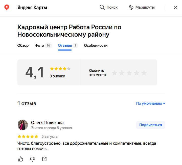 «Провели грамотную и интересную профориентацию! Спасибо!» - пишет пользователь «В.» о работе центра на улице Коммунальной, 71а в Пскове (отзыв на Яндекс.Картах от 5 августа 2025 года).