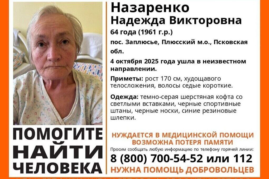 4 октября 2025 года в поселке Заплюсье пропала Надежда Назаренко 1961 года рождения, сообщили "МК в Пскове" в поисково-спасательном отряде "ЛизаАлерт" Псковской области.