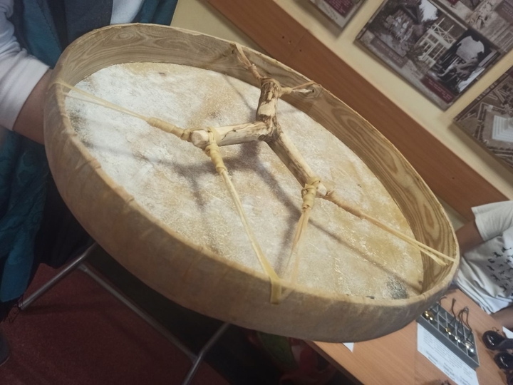 «Ойуун дүҥүрэ» — это якутский бубен, ритуальный инструмент с глубоким символизмом, который играет важную роль в шаманских практиках. Этот древнейший инструмент совершенно не поддается настройке. Его звучание может меняться в зависимости от влажности воздуха: сухая кожа звучит звонче, а влажная — глуше. Именно козья кожа придает звуку низкие, плотные и мягкие тона.