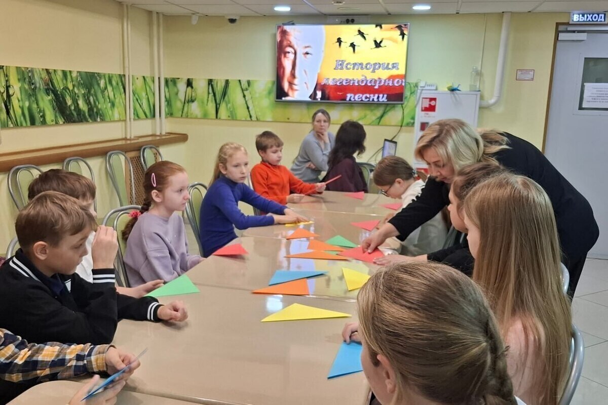 Перед занятием детям рассказали историю песни «Журавли» на стихи Расула Гамзатова, впервые исполненной Марком Бернесом, которая стала символом памяти о героях войны. Ребята с увлечением превращали обычные листы бумаги в журавликов, каждый из которых стал частью общего послания к миру и будущему без войны.