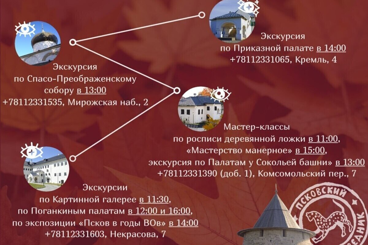 Во второй половине дня программа продолжится экскурсиями по историческим местам: в 13:00 можно будет узнать тайны Спасо-Преображенского собора, а в 14:00 – окунуться в атмосферу Приказной палаты в Кремле. Любителей истории также приглашают в 14:00 на экскурсию по экспозиции «Псков в годы ВОВ». Еще один мастер-класс по росписи деревянной ложки запланирован на 15:00. А в 13:00 состоится экскурсия по Палатам у Сокольей башни.
