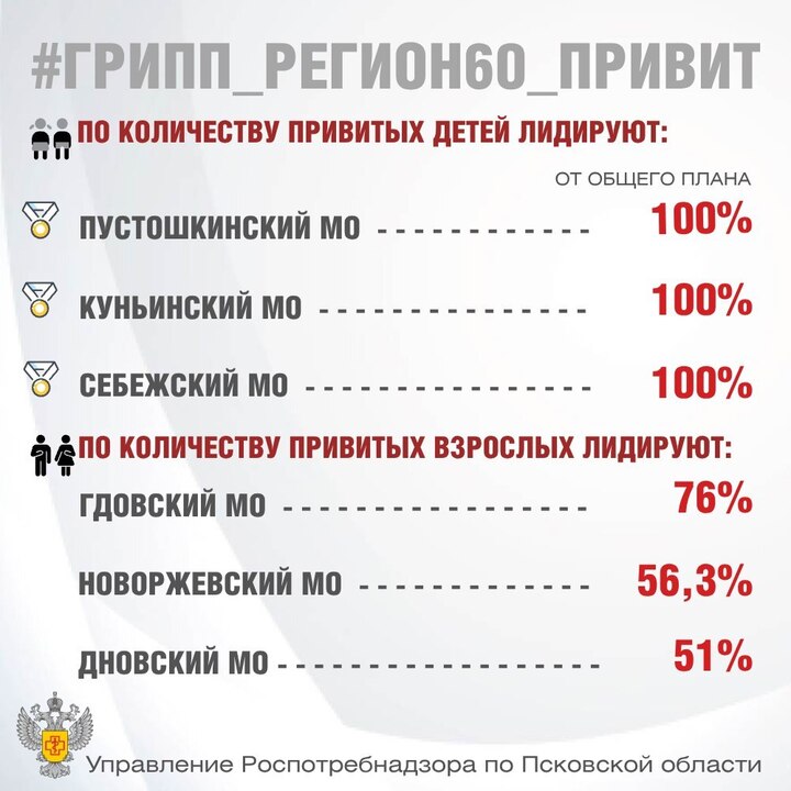 Управление Роспотребнадзора по Псковской области продолжает информационную кампанию под хэштегом #Грипп_регион60_Привит!, отмечая значительные успехи в иммунизации населения. Сегодня в рейтинге вакцинации детей от гриппа лидируют три муниципальных округа, которые полностью выполнили поставленные планы.
