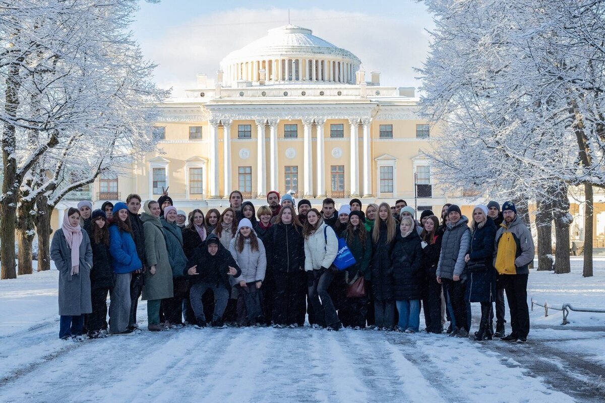 Участники побывали в двух знаковых пригородах Санкт-Петербурга. В Павловске они осмотрели дворец, который Екатерина II вручила в качестве подарка своему сыну Павлу I. Особое внимание во время экскурсии уделили послевоенной реставрации ансамбля, когда его восстанавливали почти из руин.
