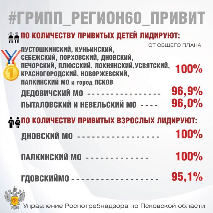 В 12 муниципальных округах и городе Пскове план вакцинации детей выполнен на 100%. Кроме того, Дновский и Палкинский районы также достигли стопроцентного показателя по вакцинации взрослого населения.