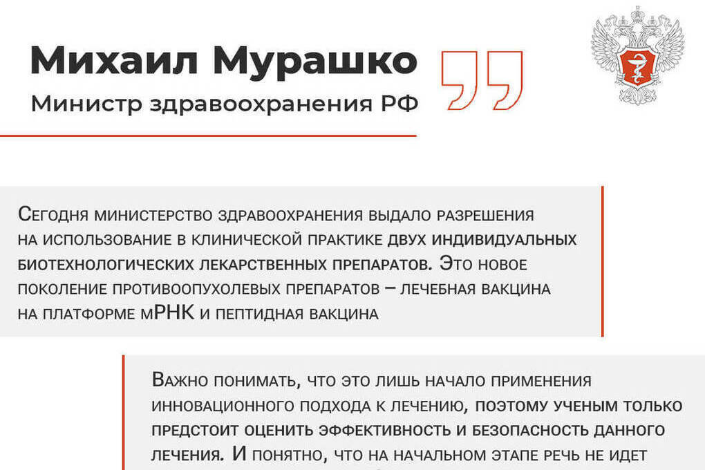 Как отметил министр здравоохранения РФ Михаил Мурашко, эти препараты представляют собой начало новой эры в борьбе с раком. "Это лишь первый этап внедрения инновационного подхода к лечению, и ученым предстоит провести тщательную оценку их эффективности и безопасности", – подчеркнул министр. Он также добавил, что на начальном этапе препараты будут иметь узкие терапевтические показания и не планируется их массовое применение. О возможности широкого использования можно будет говорить после получения полных данных об их действенности и безопасности.