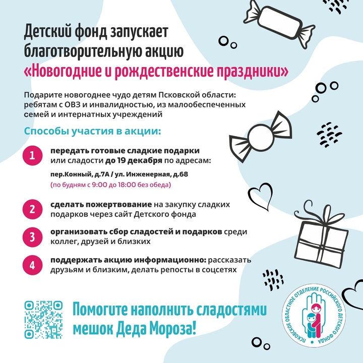 Неравнодушные псковичи могут принять участие в сборе сладких новогодних подарков для воспитанников интернатов, детей из малообеспеченных семей и детей с инвалидностью. Организаторы рассчитывают собрать около 2 830 подарков.