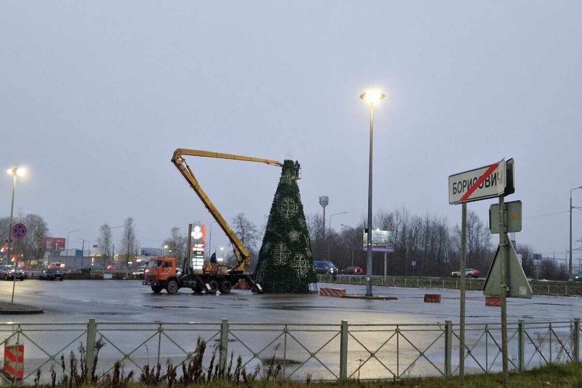 Псков продолжают украшать к Новому году. В центре Пскова уже давно сияют новогодние звездные гирлянды, красиво светятся световые полотна над мостами, не отстают и другие районы. Как сообщает Псковская Лента Новостей, сегодня новогоднюю ель устанавливают возле торгового центра Fjord Plaza.