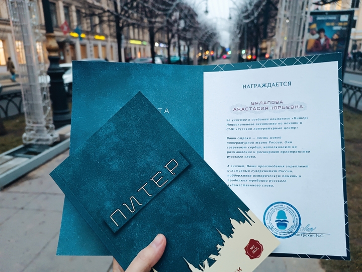 В декабрьском альманахе также были напечатаны стихи студентки первого курса Псковского государственного университета Анастасии Урлаповой. Настя учится на журналиста и это первое ее произведение, опубликованное в качестве студентки. До поступления в университет у нее уже было несколько публикаций. Сейчас она полна решимости не только получить знания и заветный диплом, но и покорять литературные вершины дальше. Стихи Анастасии были положительно оценены главным редактором "Русского литературного центра" Никитой Митрохиным. "Анастасия очень красиво пишет о простых вещах", - поделился он своим мнением с присутствующими.