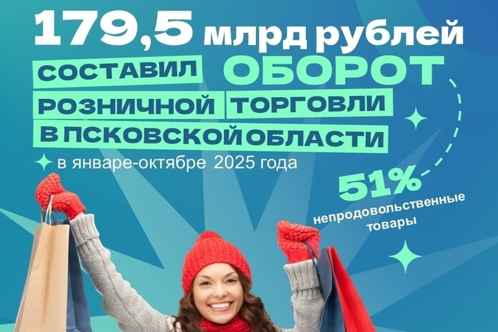Оборот розничной торговли в Псковской области за январь-октябрь этого года составил 179,5 млрд рублей. В сопоставимых ценах показатель вырос на 1,4% по сравнению с аналогичным периодом прошлого года. Об этом "МК в Пскове" сообщили в Псковстате.