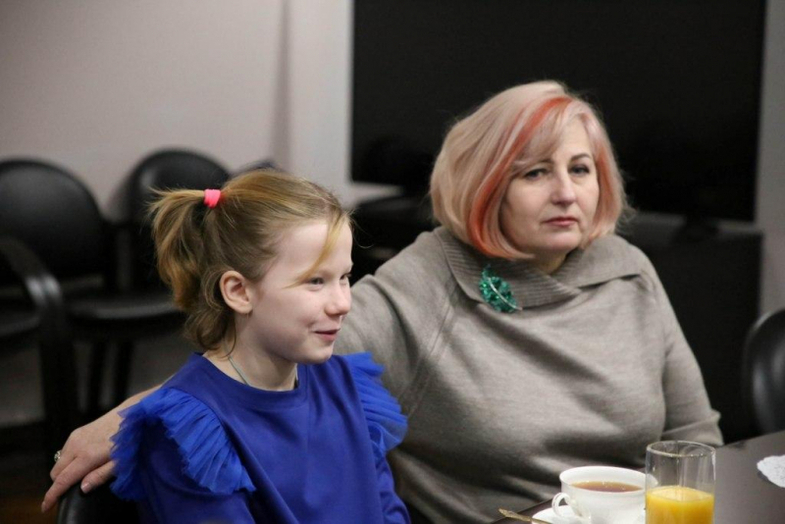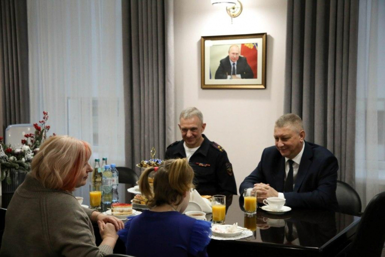 Вместе с воспитанницей Центра помощи детям на встречу приехала и его директор Любовь Орлова. Гости вручили особый подарок генерал-майору полиции — гончарный праздничный колокольчик и открытку.