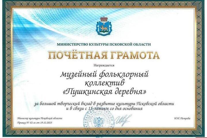 В честь своего 15-летия и за значительный вклад в развитие культуры Псковской области фольклорный коллектив «Пушкинская деревня», действующий на базе Государственного музея-заповедника А.С. Пушкина «Михайловское», удостоен Почетной грамоты Министерства культуры региона. Об этом "МК в Пскове" сообщили в пресс-службе Пушкинского Заповедника.