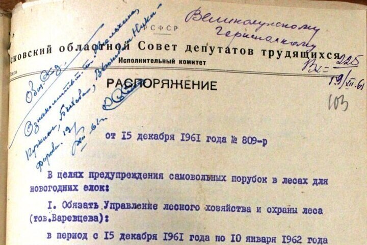 Управление внутренних дел должно было усилить контроль за провозом елей, а также привлекать к ответственности тех водителей, которые не имеют сопроводительные документов на груз. Кроме того, в Великолукском отделении Государственного архива Псковской области документов можно найти и распоряжение от декабря 1961 года о розничных ценах на живые ели.